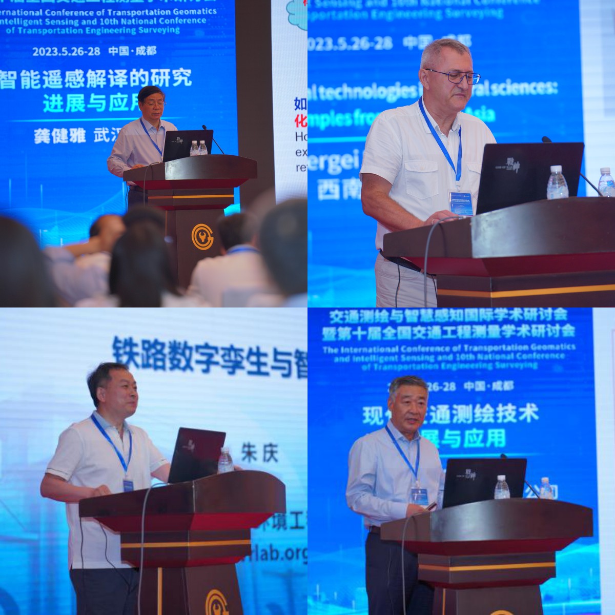 学术委员会副主任/国家级人才朱庆教授、全国工程勘察设计大师/中国铁路设计集团有限公司王长进副总工程师做大会主旨报告。四位特邀专家先后做了题为“智能遥感解译的研究进展与应用”、“Information technologies in natural sciences: example from Northern Asia”、“铁路数字孪生与智能建造”和“现代交通测绘技术发展与应用”的学术报告。四位专家就新型测绘技术在交通领域的研究进展进行了精彩讲解,赢得了与会学者的热烈掌声。