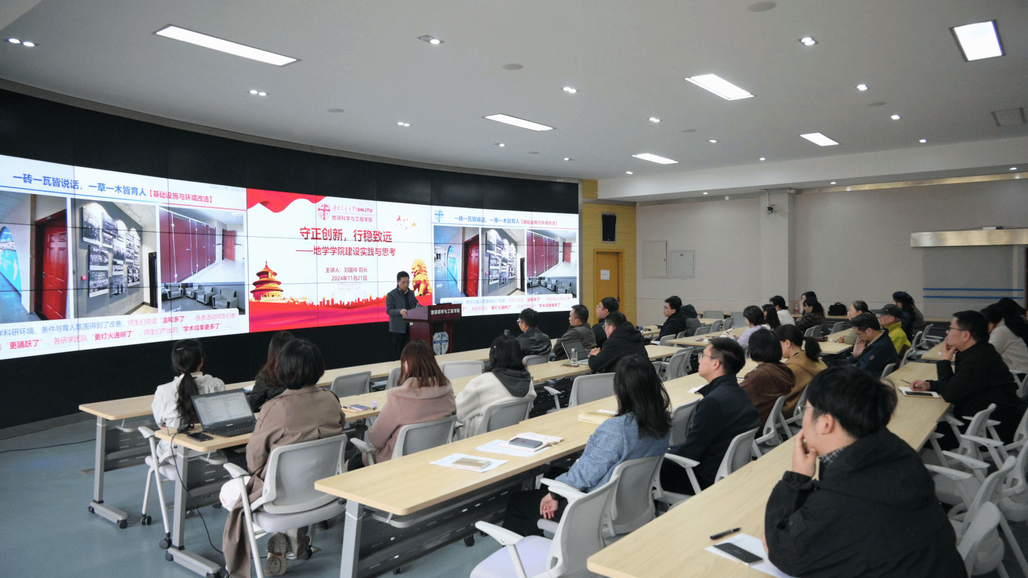 党课最后,刘国祥同志勉励全体成员,要“恒者行远,思者常新,博观约取,厚积薄发”。通过此次主题党课,与会人员深刻认识到加强人才队伍建设、产出高水平教学科研成果、加速推进地学一流学科专业建设、提升地学人才培养质量的重要性,深受教育和鼓舞,纷纷表示将认真把此次党课内容“吸收消化”,增强斗争意识,提高干事本领,为学院人才培养质量提升、国际化建设贡献智慧与力量。