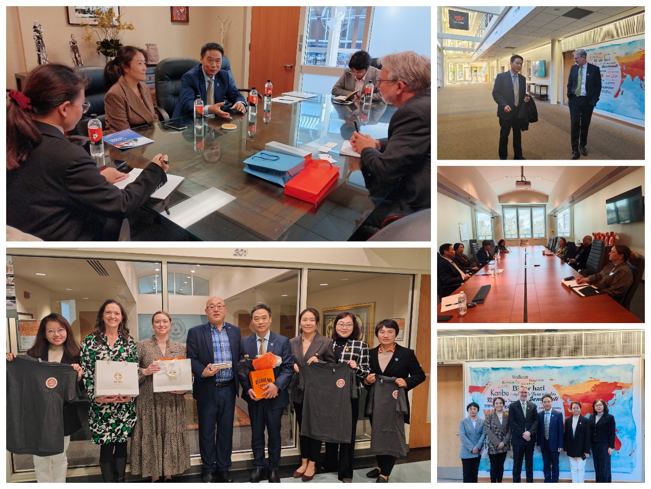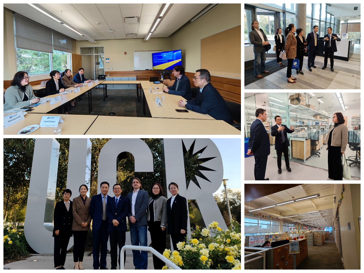 随后,代表团前往加州大学河滨分校进行访问,受到该校国际事务处副教务长Marko Princevac、国际招生与战略发展助理教务长Jun Wang及继续教育学院项目开发总监David Dayton的热情接待。双方针对未来合作模式、学生硕士项目申请要求、全球师资派遣展开讨论并达成初步共识。随后,代表团还参观了加州大学河滨分校教学楼、学生支持服务中心、学生科研创新中心,对学校实验室设施和校园环境表示高度赞赏。