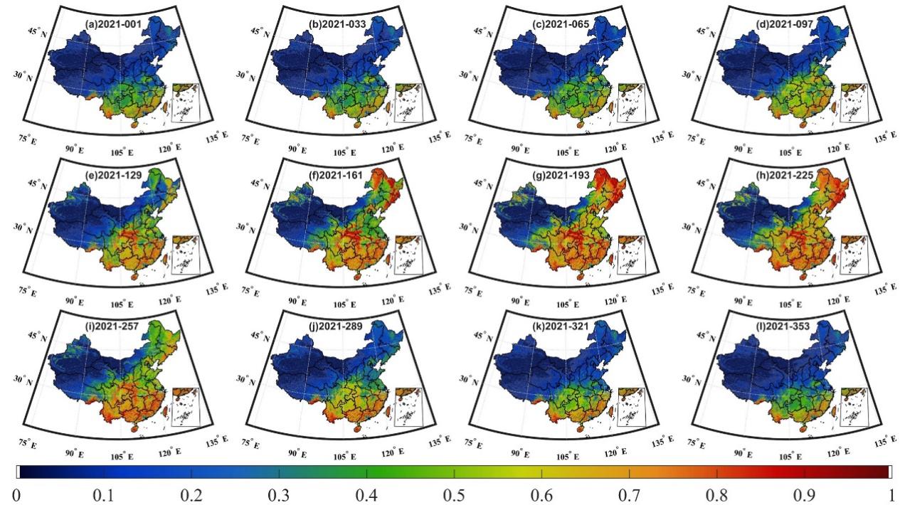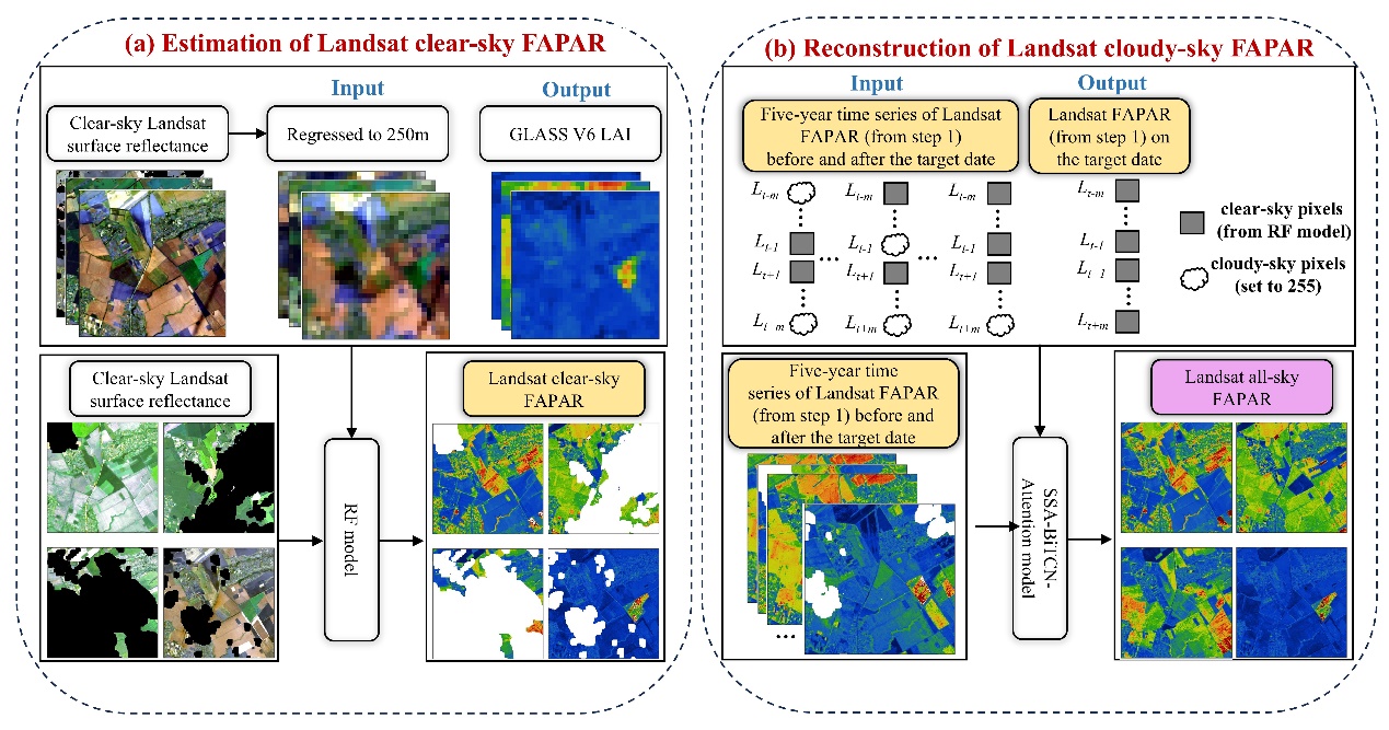 FAPAR是衡量陆地生态系统固碳能力的关键指标。以往的中低分辨率FAPAR遥感产品虽然支持了全球植被动态研究,但难以刻画复杂地表的空间异质性,限制了局地精细尺度应用。该研究提出两步法解决了这一难题:首先,在晴空条件下,利用预先训练的随机森林回归模型从陆地卫星(Landsat)地表反射率观测中反演FAPAR;然后,应用带有注意力合优化机制的新型双向时间卷积网络(SSA-BiTCN-Attention)重建缺失的FAPAR值。研究结果表明,该方法能准确预测不同土地覆盖类型的缺失FAPAR值,均方根误差在0.08至0.12之间。通过与地面实测数据对比验证,估算的Landsat FAPAR与地面测量结果高度一致,决定系数(R⟡)值在0.82至0.92之间。应用该方法生成了中国地区2013至2023年间30米分辨率、16天间隔的无缺失FAPAR产品。