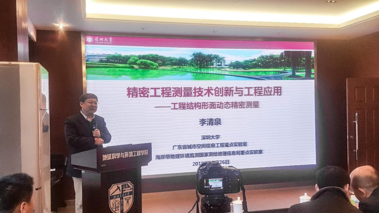 2018年11月29日上午10点,深圳大学校长李清泉教授应邀到我院进行学术讲座及学术交流。李教授是973首席科学家,863领域专家,百千万人才国家级人选,教育部科技委委员,欧亚科学院院士,何梁何利科技进步奖获得者,国务院特殊津贴获得者;中国测绘学会副理事长,中国地理信息产业协会副理事长。
