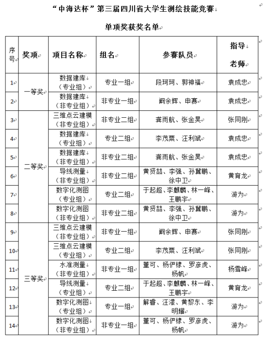 我校参加了全部项目的竞赛,经过3天的紧张角逐,获得团体一等奖,以及2项单项一等奖,6项单项二等奖,6项单项三等奖。这也是我校参加四川省大学生测绘技能竞赛以来获得的最佳成绩。