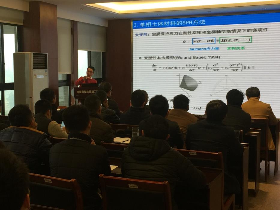 受聘仪式之前,彭翀研究员作了题为“光滑粒子流体动力学(SPH)数值方法及其在地质灾害模拟中的应用”的精彩学术报告。彭翀研究员在介绍SPH方法的基础上,通过大量算例展示了其近年来将SPH用于两类典型而复杂的地质灾害——滑坡和泥石模拟分析的研究成果,包括:(1)单相的SPH岩土材料模拟方法;(2)基于多相混合物理论的多层SPH粒子计算方法;(3)基于CPU-GPU大规模并行计算的SPH程序,可用于滑坡或边坡稳定分析,以及泥石流启动、流动和沉积的动力学全过程模拟。