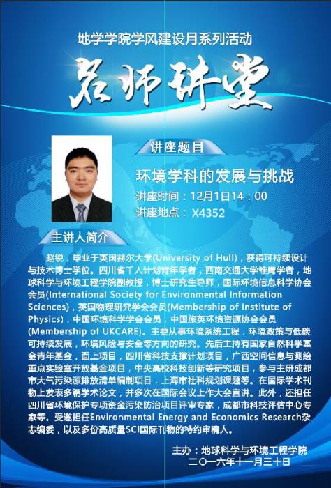 赵锐教授主讲,讲座题目为“环境学科的发展与挑战”。讲座由污污漫画