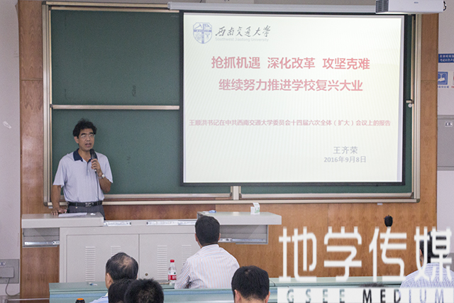 委员会十四届六次全体(扩大)会议上的讲话精神,即“抢抓机遇、深化改革、攻坚克难,继续努力推进学校复兴大业”并从“学校第十四次党代会以来主要工作推进情况、学校发展面临的新形势、学校下一阶段重要工作任务安排以及全面从严治党,为学校改革发展做好引领与保障”四个方面系统地总结了会议要点。除此之外他还介绍了王顺洪书记赴深圳调研学校研究院的相关情况以及徐飞校长对当下学校面临的发展形势的分析,并对2016年下半年工作要点的部署安排。