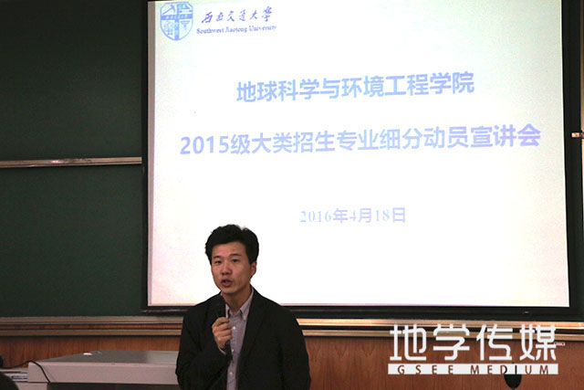 4月18日12点40分,旨在帮助2015级本科生全面了解各专业设置、现状与发展情况,近距离、面对面地与专业教师交流、沟通,主动引导学生结合自身兴趣、特长、性格、学习能力等条件因素,理性选择主修专业的大类招生专业细分动员宣讲会于犀浦校区四号教学楼X4152和X4155教室分别举行。本次宣讲会的宣讲专业分别为测绘工程、遥感工程、地理信息系统和环境工程、消防工程。负责学生工作的我院党委副书记傅尤刚等领导及相关教师参加了本次宣讲会。