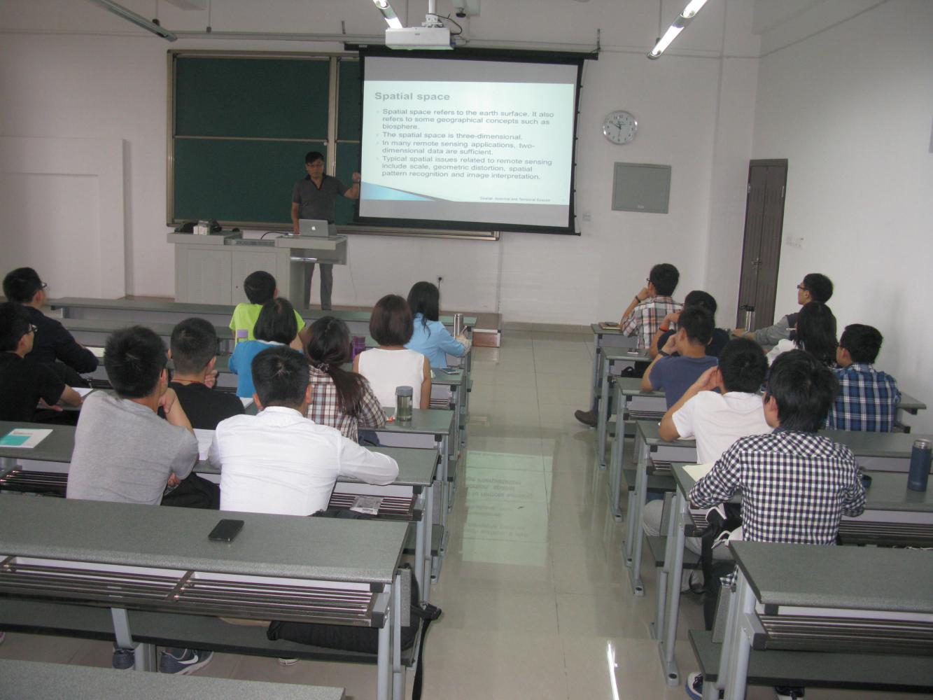 2015年5月25日上午,我院海外院长、香港浸会大学周启鸣教授负责的《遥感应用模型》研究生课程在X9405教室正式开课。我院遥感信息工程系讲师慎利博士担任课程助教。