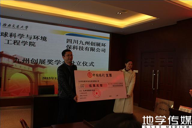 最后举行九州创展奖学金设立仪式。傅尤刚副书记代表学院对九州创展环保科技有限公司慷慨解囊、捐资助学表示衷心感谢,并对该项奖学金评选对象、评定条件等进行简要介绍。