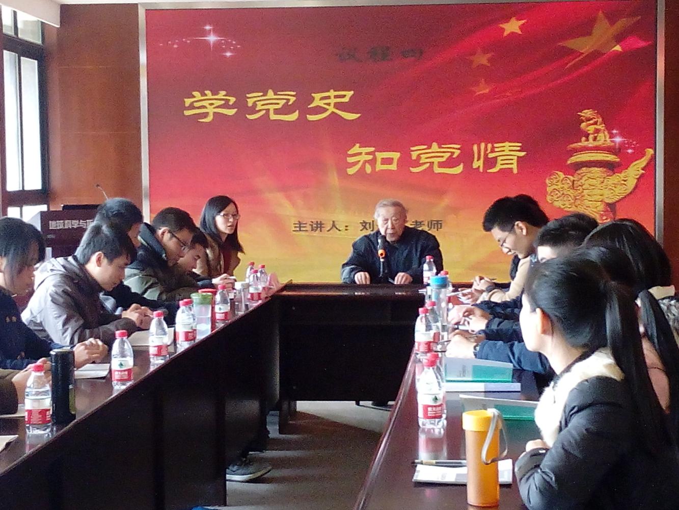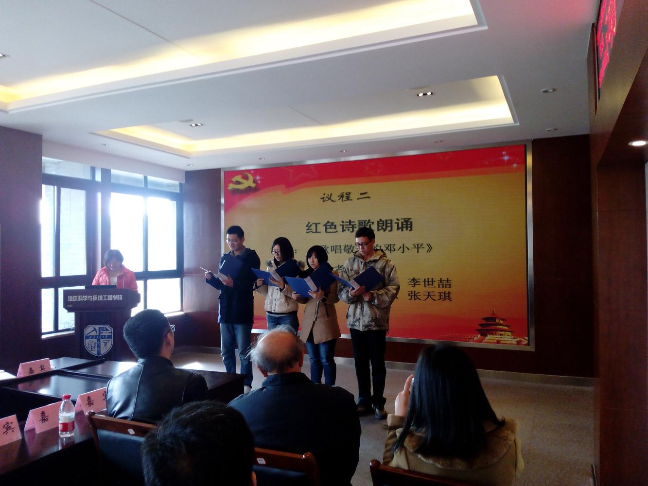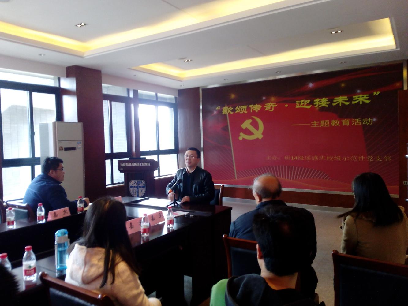 研14级遥感班校级示范性党支部特色活动——“歌颂传奇 迎接未来”主题教育活动于2014年12月12日在犀浦校区召开。院党委副书记傅尤刚、离退休党支部书记刘冠军、辅导员邓思然、田凤晓应邀出席了活动。
