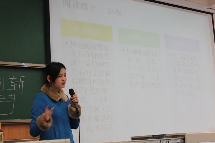 然后是李丹学姐关于英语学习的小技巧的一些分享,李丹学姐耐心讲解自己在学习过程中摸索出来的经验规律,详细剖析四六级各个题型,积极和同学们互动,听取同学们的问题所热情解答。