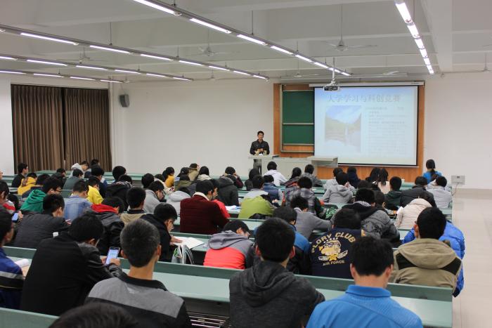 在主持人简单的介绍之后,苏晗学长和同学们交流大学学习和科创竞赛的经验。通过介绍自己大学四年从院级到国级的各类竞赛经验,告诉大家准备充分并多了解多学习的好处。他简单回顾了和导师做科研项目的经历,提出学习存在潜在巨大价值,即使过后有所遗忘也要坚持的观点,让同学们受益匪浅。