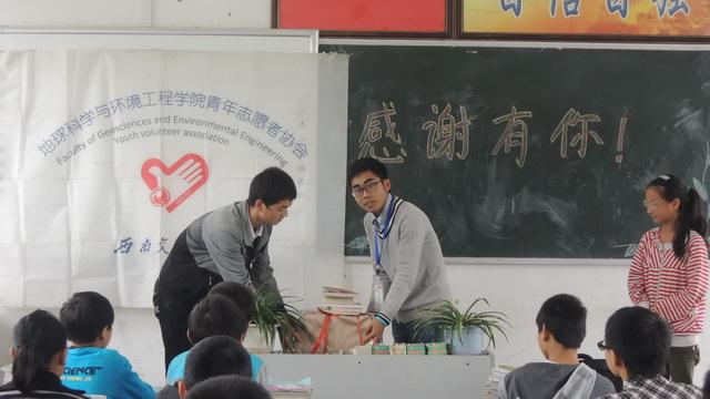青川县是“5.12”地震的重灾区,五年前的灾难给予了这个原本就贫困的县城沉痛的打击。志愿者们为此专门走访了青川县的沙洲中学。当了解到这些孩子平时基本没有课外读物,志愿者们特地用大家捐献的军训服获得的资金购买了一批图书送给沙洲中学的孩子们。此外,青协还用这笔资金作为助学金发放给一些品学兼优,但家庭条件困难的同学。青协会长李小龙鼓励同学们好好学习,成功成才,将这样的志愿者精神传承和发扬下去。除了沙洲中学的同学们,志愿者们也给一些农民工一些衣服和鞋子,给予他们力所能及的帮助。
