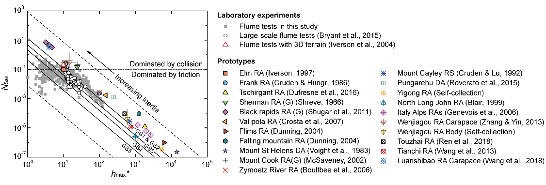 (5)统计分析结果表明,对于真实尺度下的高速远程滑坡,其Savage数大多低于0.1,流态总体表现为密集态,即密集颗粒流(dense granular flow)(图6),因此,这种密集颗粒流的运动状态是高速远程滑坡堆积体中层序保留、表面流态化地貌形态等典型堆积特征发育的重要前提。