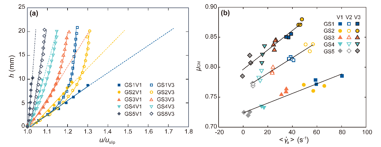 图4 (a) 不同粒径及体积条件下的颗粒流平均速度剖面;(b) 平均剪切速率与等效摩擦系数关系
