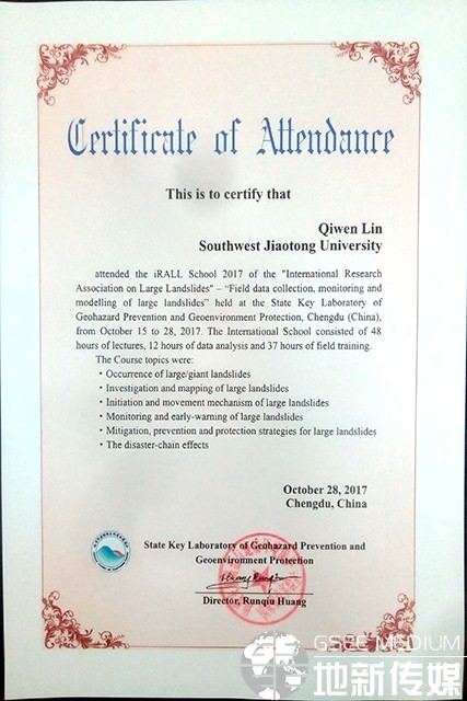 In October 2017, Lin Qiwen, Ph.D. student of the Faculty of Geosciences and Environmental Engineering, participated in the “iRALL School 2017” International Doctoral Training Course hosted and funded by the State Key Laboratory of Geo-hazard Prevention and Geo-environment Protection (SKLGP) of Chengdu University of Technology.